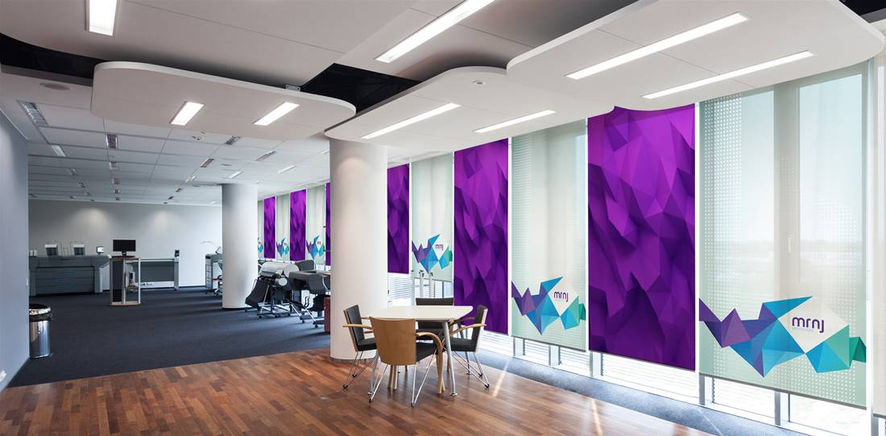 Available in light-filtering or blackout materials, graphic shades allow flexibility in privacy and light management, making them ideal for retail stores, offices, and commercial buildings.